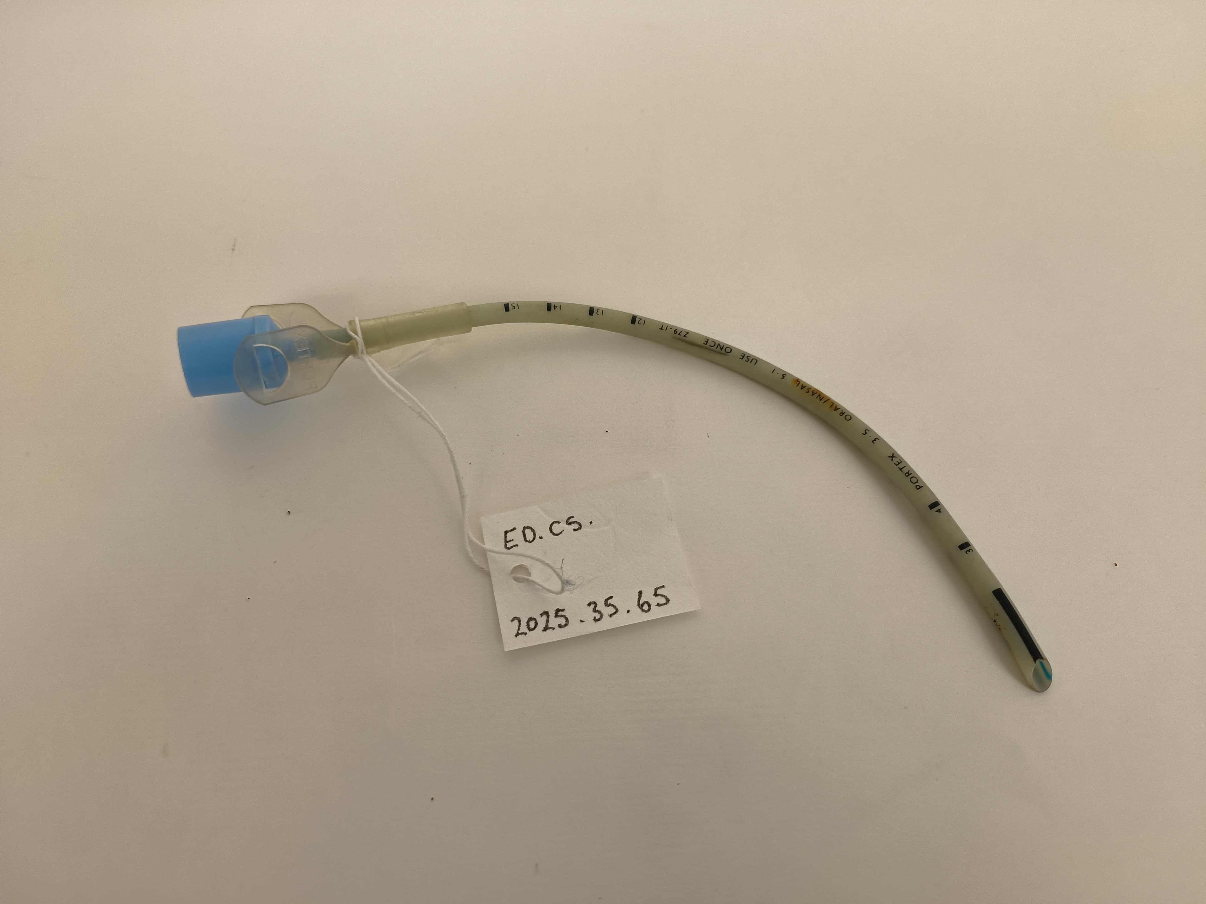 Portex intubation tube. Blue plastic cap attached to a flexible tube, which has numbers 3-15 spaced along it. Also written along the tube is 'Portex, oral/nasal, use once'.