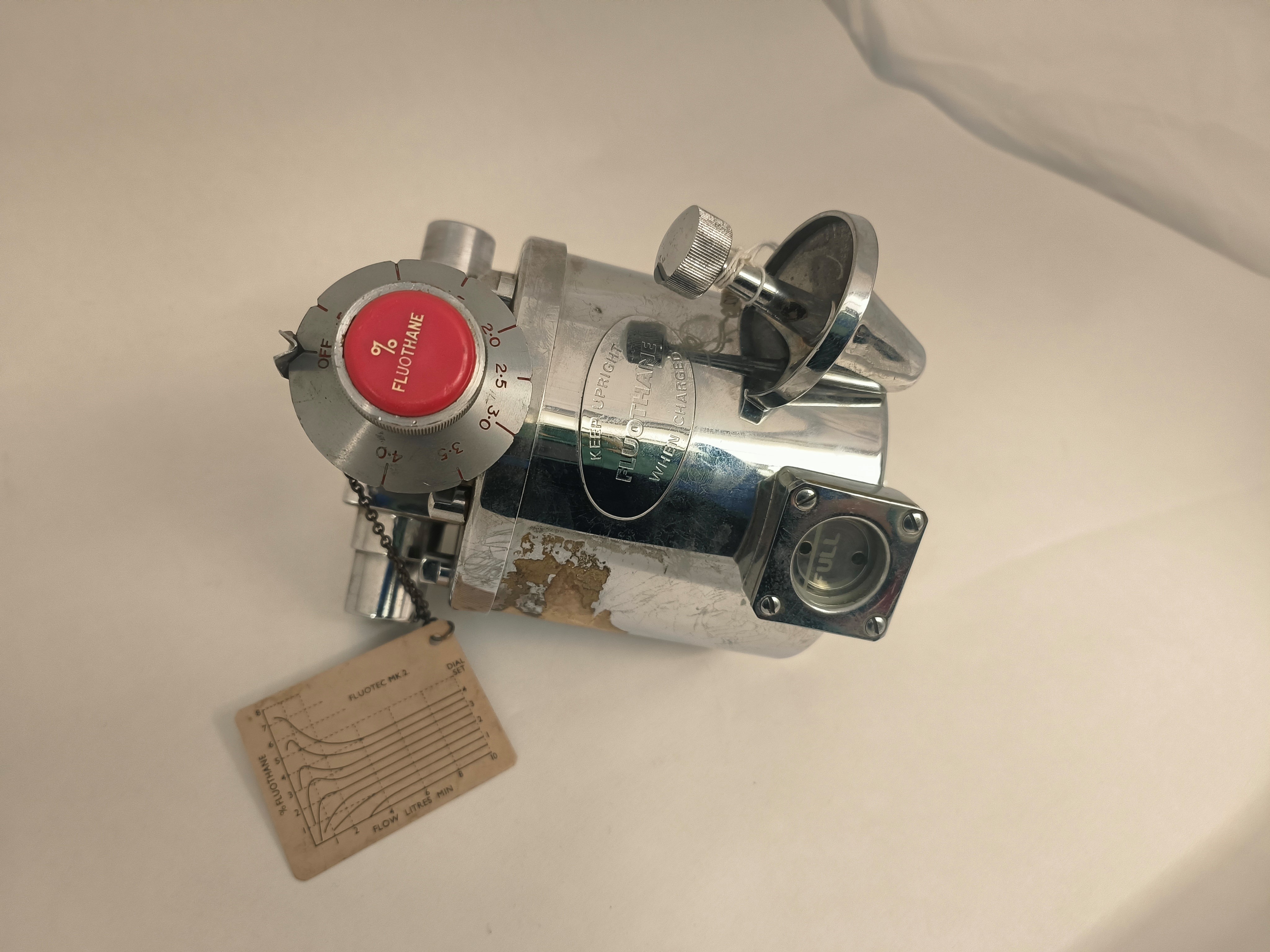 Metal fluothane (halothane) vaporiser. Heavy cylindrical body with a circular glass window on one side with a line m arked 'full', and a larger protruding port with a metal screw stopper. The body of the vaporiser is marked 'Flouthane, keep upright when chraged'. At the top of the cylander is a circular dial, the centre of which is red and inscribed '% fluothane'. Can be turned between 'off' and 4.0. Connected to this is a large double ended valve, which has a black metal plaque on the top reading'Fluotec Cyprane Ltd' along with a serial and patent number. Attached by a chain at the top of the vaporiser is a plastic card showing a chart of standard deviations at lower flows.